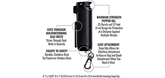 En cas d’accident, ce dispositif de Sabre Red permet également une sortie rapide du véhicule en facilitant la coupe de la ceinture de sécurité défectueuse grâce à sa fonction intégrée. De plus, la pointe en acier inoxydable d’une grande dureté permet de briser la vitre d’un véhicule, offrant ainsi une solution polyvalente et rapide en situation d’urgence. En quelques secondes seulement, il offre la possibilité de réagir efficacement face à des situations critiques.