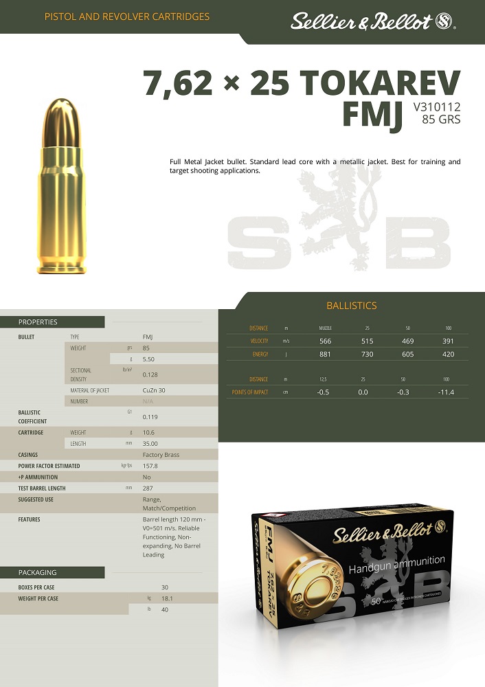 CARTOUCHES S&B CAL. 7.62 x 25 Tokarev 85 Grs. FMJ