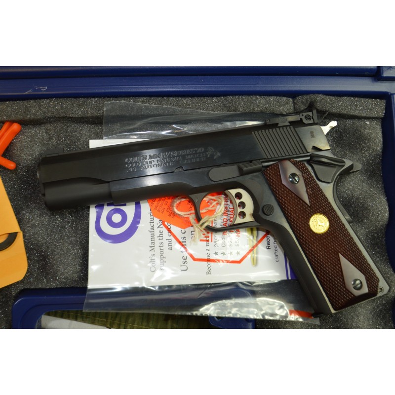 Le Colt Gold Cup est connu comme étant le meilleur pistolet semi-automatique au monde, et est la norme pour les armes de compétition. Le premier pistolet Colt Gold Cup a été introduit à la fin des années 1950. Il ont été utilisés pour participer aux compétitions des clubs locaux jusqu’aux compétitions nationales à Camp Perry. Le modèle National Match est équipé d’une déténte large réglable, d’un canon de match national en acier inoxidable, d’un viseur cible réglable et de nombreux autres raffinements de série. Poignées en noyer quadrillées avec Médaillons en or. Canon de 5 pouces. Détente Simple Action. Capacité : 8 + 1 coups.