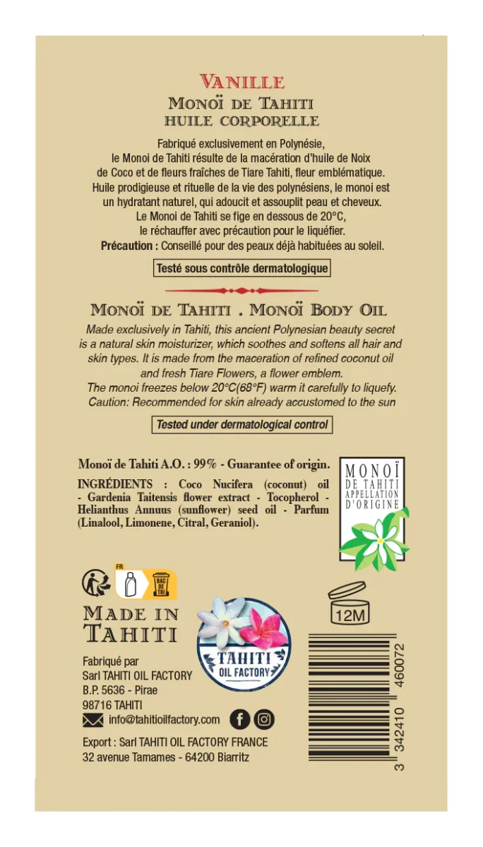 - Matière: 98% Monoi de Tahiti, Designation of Origin (Appellation of Origin). Contains neither colourants nor sunscreen